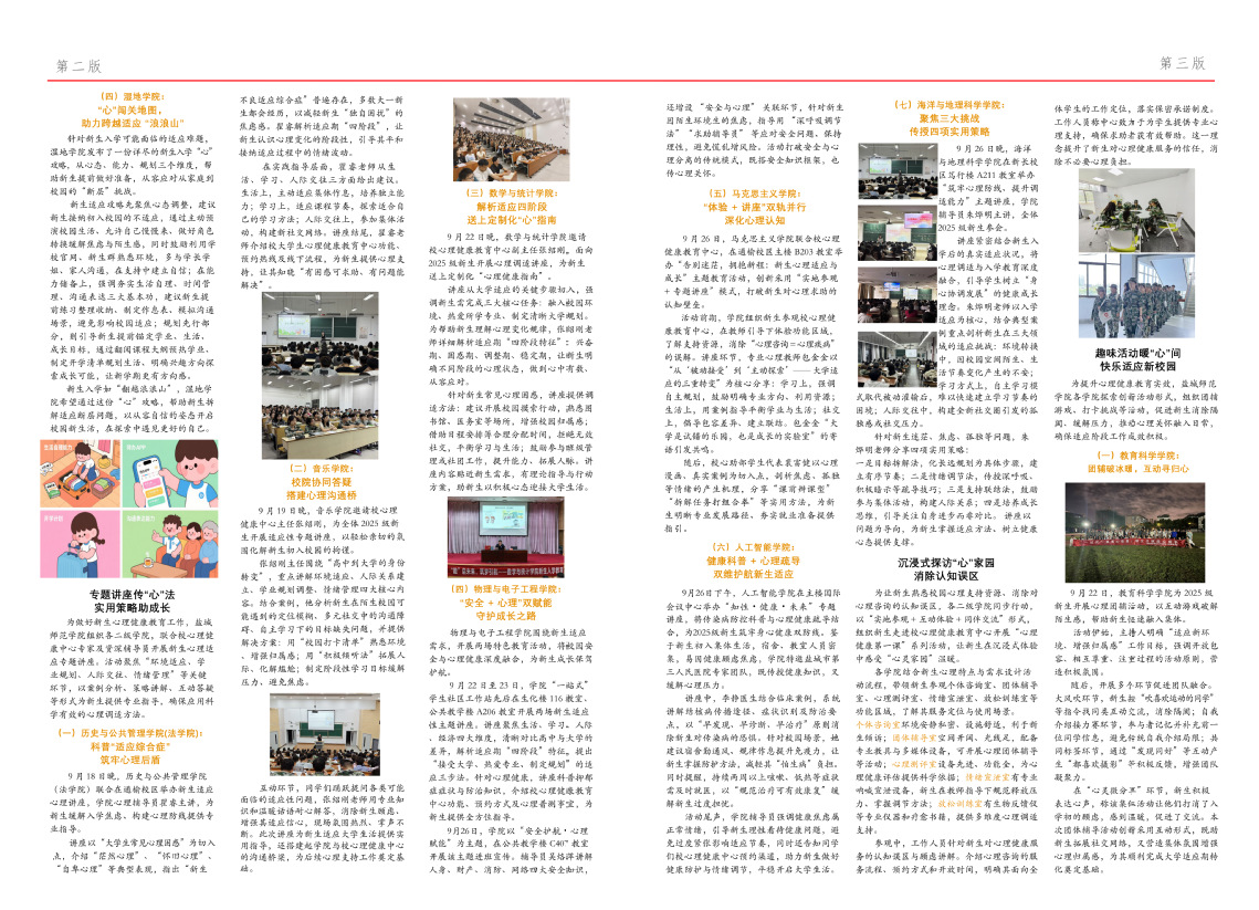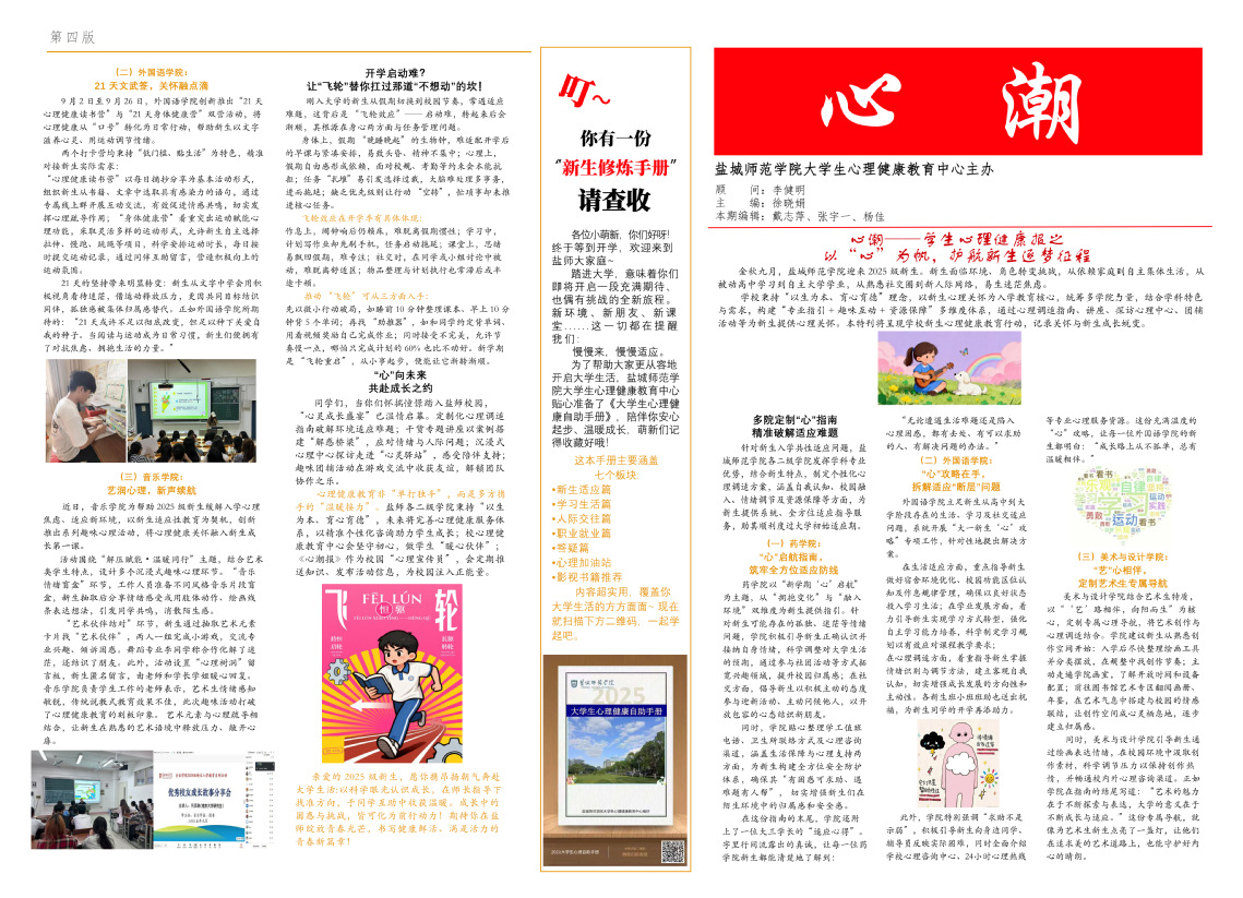 为了让2025级新生适应开学心理问题,盐城师范学院大学生心理健康教育中心依托《心潮报》,针对2025级新生,联合多学院开展专题讲座、趣味活动、沉浸式体验等多元心理健康教育活动,还推出新生修炼手册,从心理适应、人际社交等多维度科普知识、提供成长指南,助力新生跨越心理难题,从容开启大学征程。
