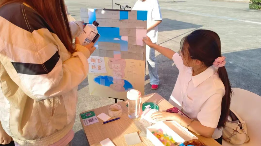 活动设置“心灵‘树洞’盲盒”“用药‘红绿灯’”和“撕掉‘定义标签’”三大互动板块。同学们通过静心呼吸练习、精神健康知识问答、撕掉偏见标签等形式,在轻松氛围中学习身心调适方法,传递尊重与关怀。