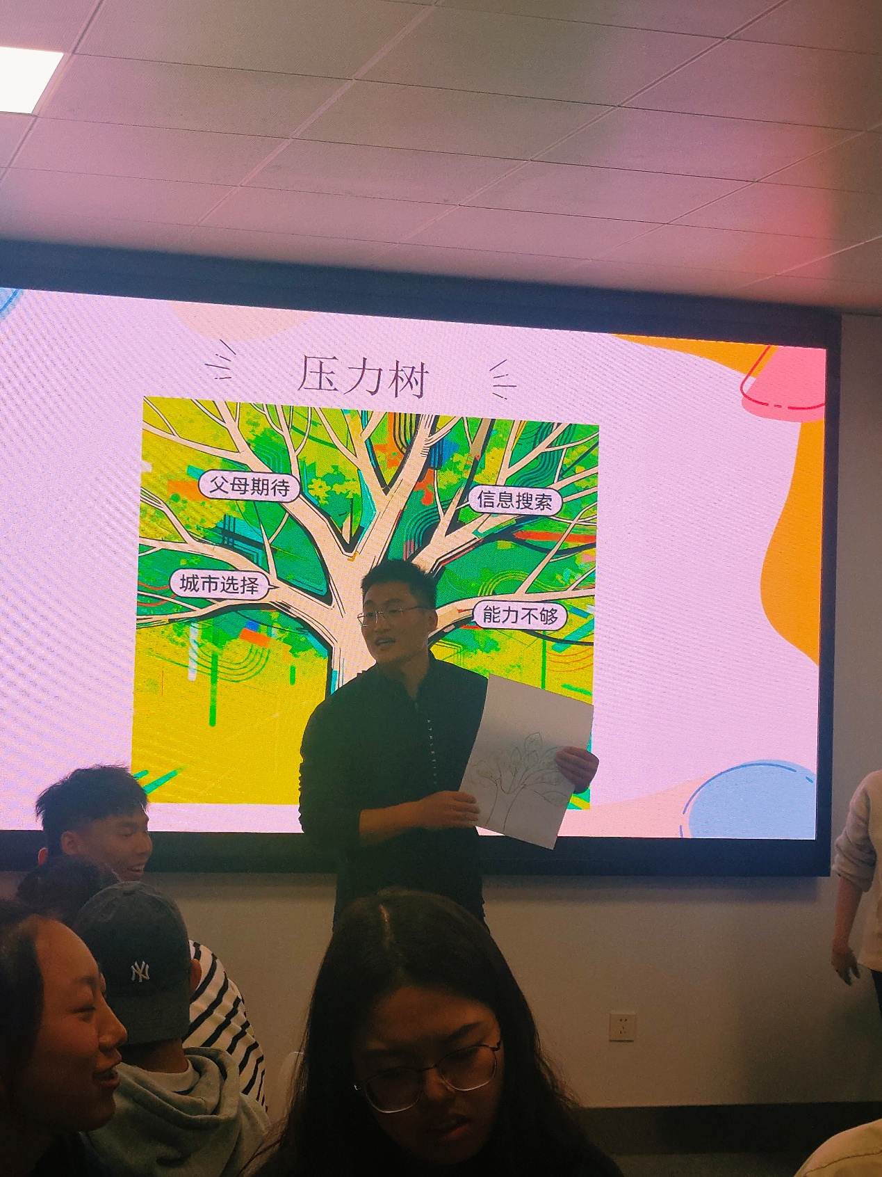 活动中,体育学院的同学们在小组合作、主题绘画共创、角色演绎心理剧等互动环节中积极投入,热情高涨,充分展现了自我表达的勇气与团队协作的精神。整场活动紧扣“知—情—行”三维逻辑层层递进,有效帮助同学们精准识别压力来源,科学疏导心理焦虑,并在同辈交流中搭建了支持网络,提升了心理调适能力。