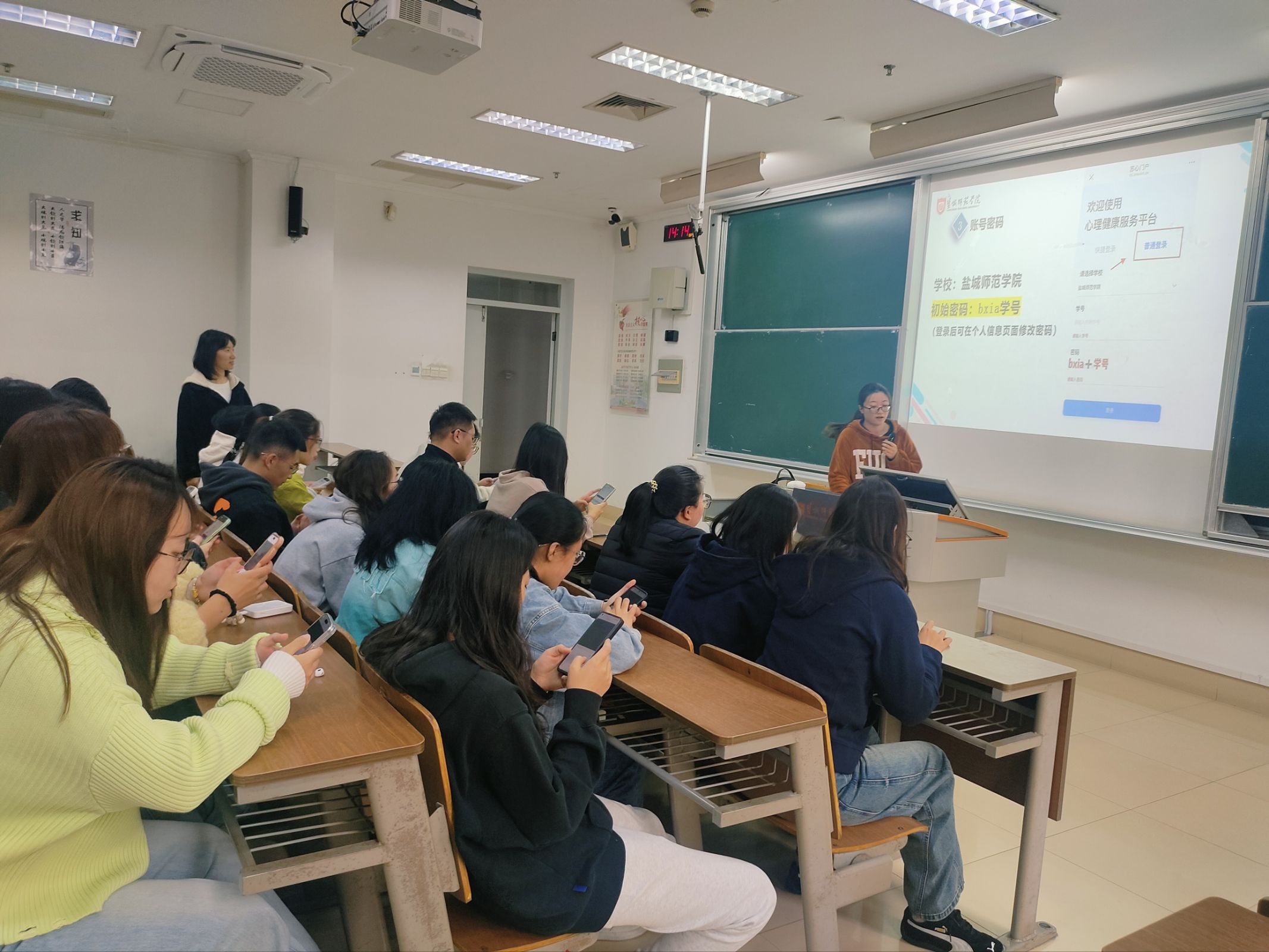 在动员环节,班主任刘婧婧老师强调,心理普测是了解自身心理状态的科学途径,鼓励同学们卸下顾虑、真实作答,善用科学服务为成长赋能。主讲人李方芳同学则深入浅出地普及了心理健康测评的意义,并通过可视化拆解步骤、现场演示“苏心门户”登录流程,提供了精准的技术支持,确保了测评高效推进。随后,同学们在集中组织下认真完成了测评问卷,现场秩序井然。