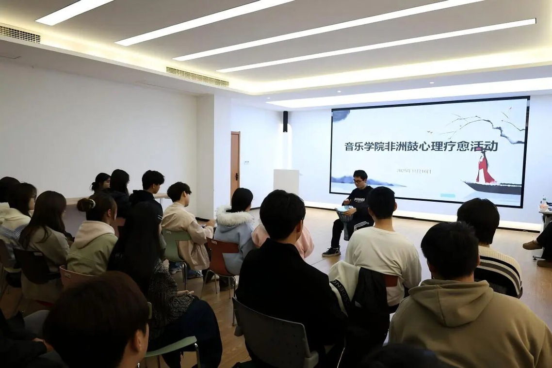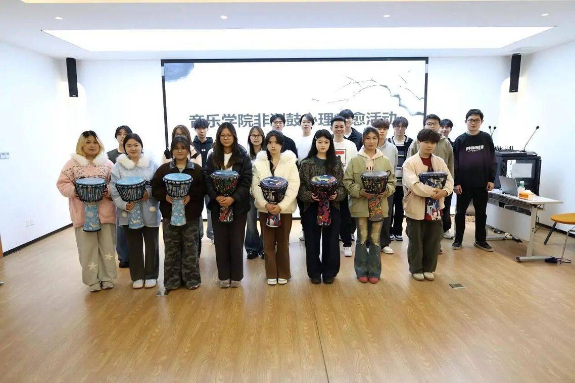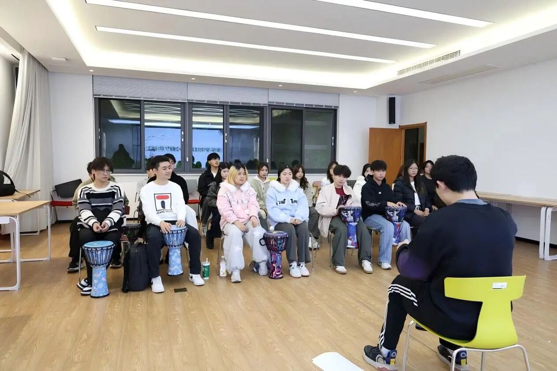 持续提升心理育人实效,帮助学生在节奏体验中释放压力、调节情绪,11月5日、11月16日音乐学院在学工楼“悦空间”,面向同一批学生群体两次开展了“鼓点叩心,乐愈青春”非洲鼓心理疗愈系列活动。通过连贯、深度的节奏训练与心理引导,活动切实提升了参与学生的情绪管理与心理调适能力。