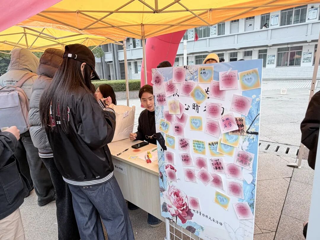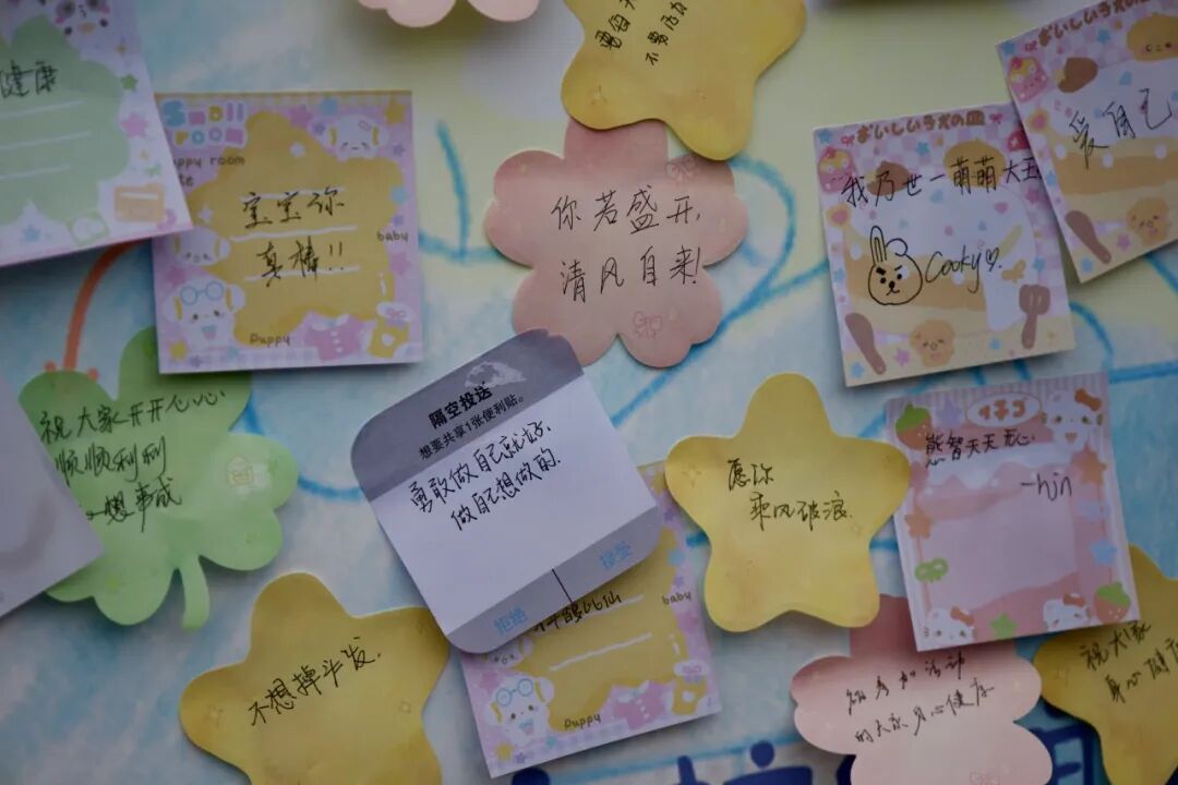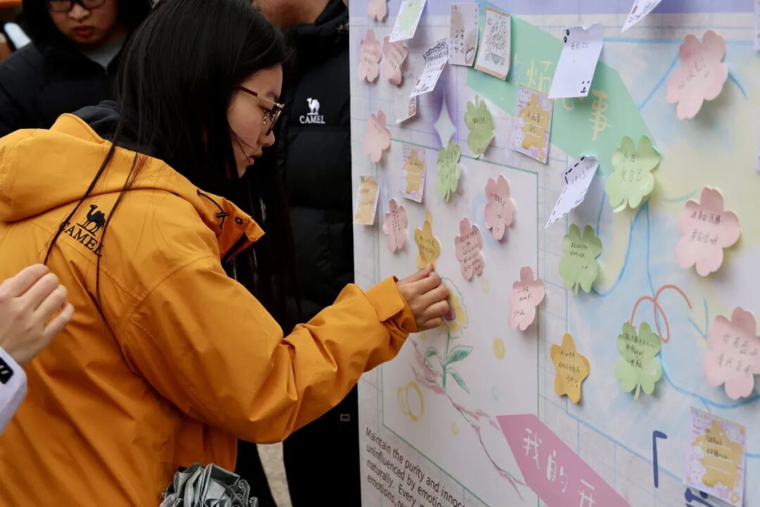 在便签墙上书写烦心事与开心事,传递真心与善意;参与抽签解锁新学期运势,挑选彩色丝带表达当下心情,在简单治愈的互动中,释放学业压力,接纳自我情绪,在春日里收集小确幸、充盈正能量。