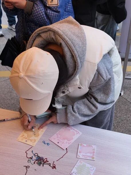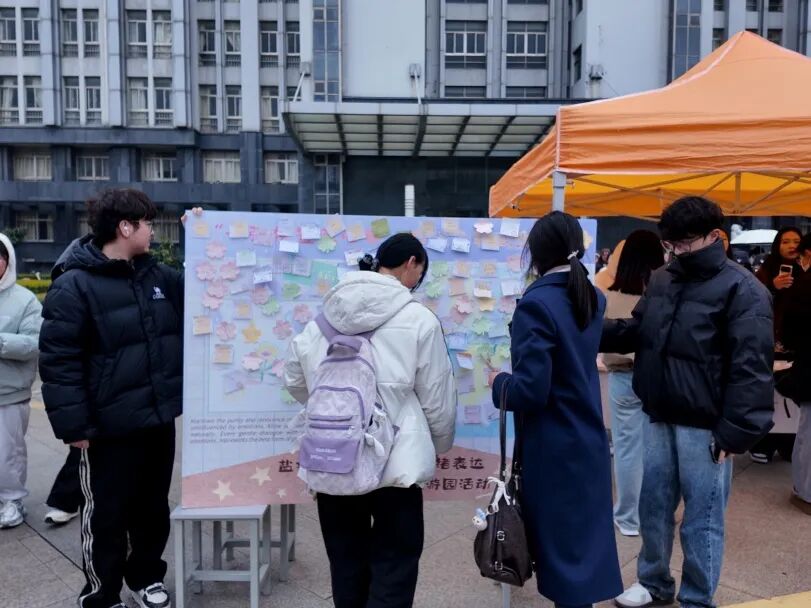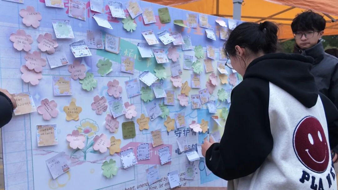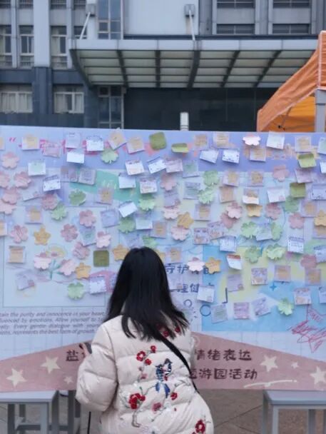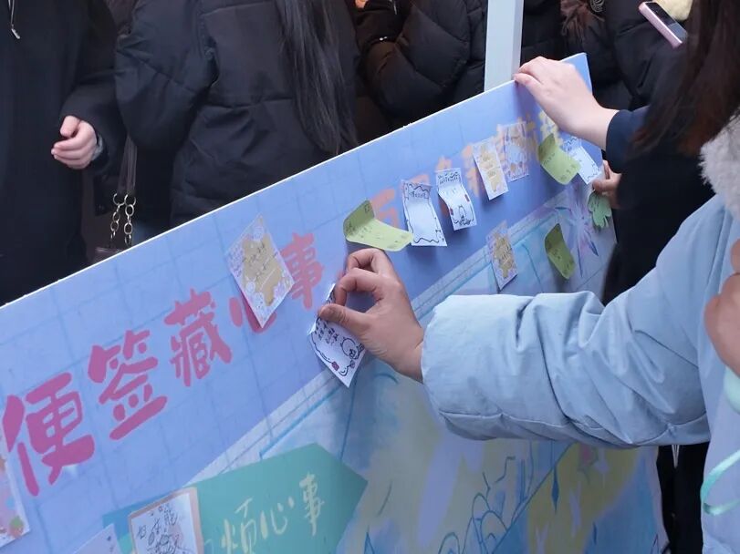 同学们或低头书写心事,或驻足欣赏便签墙,欢声笑语交织成春日里最动人的旋律。大家在沉浸式体验中释放压力、舒缓情绪,在彼此的温暖互动中收获慰藉与力量。